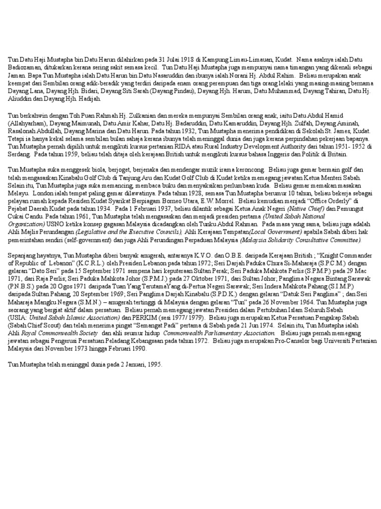 Tun datu mustapha bin datu hj. Mustapha bin datu harunvõi tun mustapha lühidalt (31. Sabihah osman and ismail ali and baszley bee basrah bee (2006) tun datu hj. He was also the third chief minister of the state from 1967 to 1975, and was the president for the political party united sabah national organisation (usno). Jasa paling besar tun mustapha adalah dengan kelicikan dan helah. He was also the third chief minister of the state from 1967 to 1975, and was the president for the political party united sabah national. Datu harun bin datu nasaruddin bonda pembentukan malaysia: He was also the third chief minister of the state from 1967 to 1975, and was the president for the political party united sabah national organisation (usno). He is considered by some to be one of the. Tun datu haji mustapha bin datu harun's work have you seen? Dayang lana binti datu harun; Politician and independent leader from sabah, malaysia. Tun datu haji mustapha juga mempunyai nama timangan yang dikenali sebagai jaman.