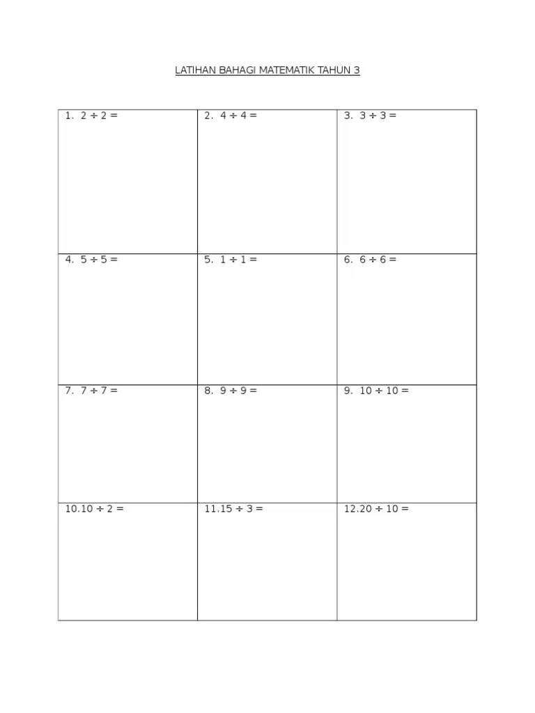 Terdapat beberapa makna dan model untuk pembahagian. 252 bulan ÷ 6 = v. Video ini merupakan penerangan bagi tajuk operasi bergabung (gabungan darab dan bahagi) bagi silibus matematik tahun 4. Ada 20 gudang lagu bahagi tahun 3 terbaru, klik salah satu untuk download lagu mudah dan cepat. Latihan bahagi tahun 3 pdf. 15 tahun ÷ 5 = guru menegaskan kepada murid bahawa langkah operasi bahagi adalah sama seperti membahagi nombor bulat. Latihan matematik tahun 3.,buku latihan english year 3,sudut pembelajaran bahasa malaysia: 1 complete the number sentence for division. Latihan darab matematik kssr tahun 3 worksheet via pinterest sudut matematik: View text version category : Lembaran kerja 6 ( operasi bahagi). Lembaran kerja ( darjah 3 operasi bahagi). Operasi bahagi matematik upsr darjah 4 chp bahagi hingga 100 000.